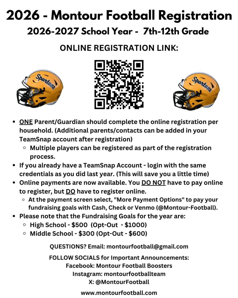 Online Payments Are Now Available through the online Fall 2025- Montour Football Registration Form below.